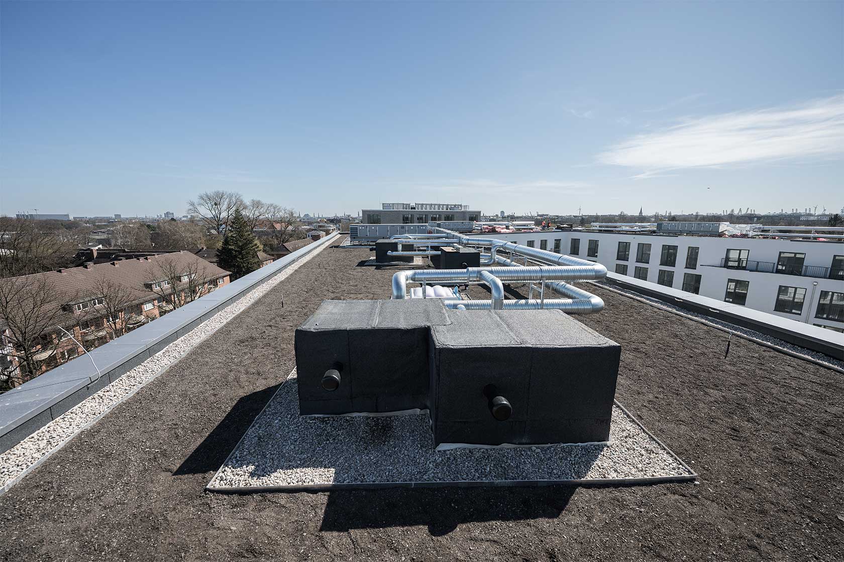 In urbanen Gegenden wie Hamburg Bahrenfeld kann es heiß werden. Denn versiegelte und dunkle Oberflächen speichern Hitze, welche in heißen Sommertagen kaum abkühlt und vor allem auch nachts weiter Wärme an die Umgebung abgibt. Infolge des Klimawandels heizen solche Hitzeinseln urbane Gebiete zusätzlich auf. Eine Lösung bieten begrünte Dächer: Sie sorgen für ein besseres Mikroklima im Wohnbereich und in der Stadt. Denn Schatten und Verdunstungseffekte der Vegetation kühlen die Umgebung und wirken zusätzlich wie eine natürliche Isolationsschicht, die das darunterliegende Gebäude vor direkter Sonneneinstrahlung und Hitze schützt.