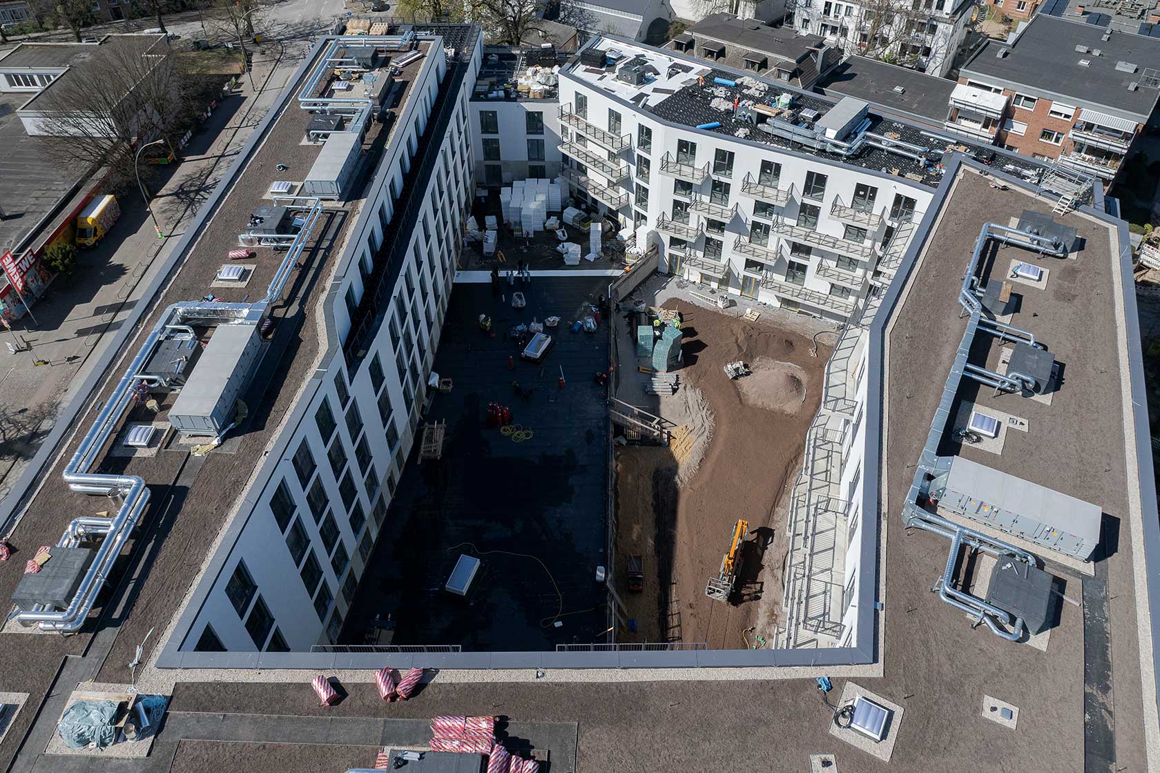 Poburski Futura erhielt den Auftrag für die Flachdachabdichtung und die Erstellung eines Retentionsdaches sowie für die Innenhofabdichtung des Bahrenfelder Carrés. Aufgeteilt auf Hauptdach, Innenhof und Terrassen wird insgesamt eine Fläche von ca. 5000m² abgedichtet. Die Arbeiten begannen im Juni 2024.